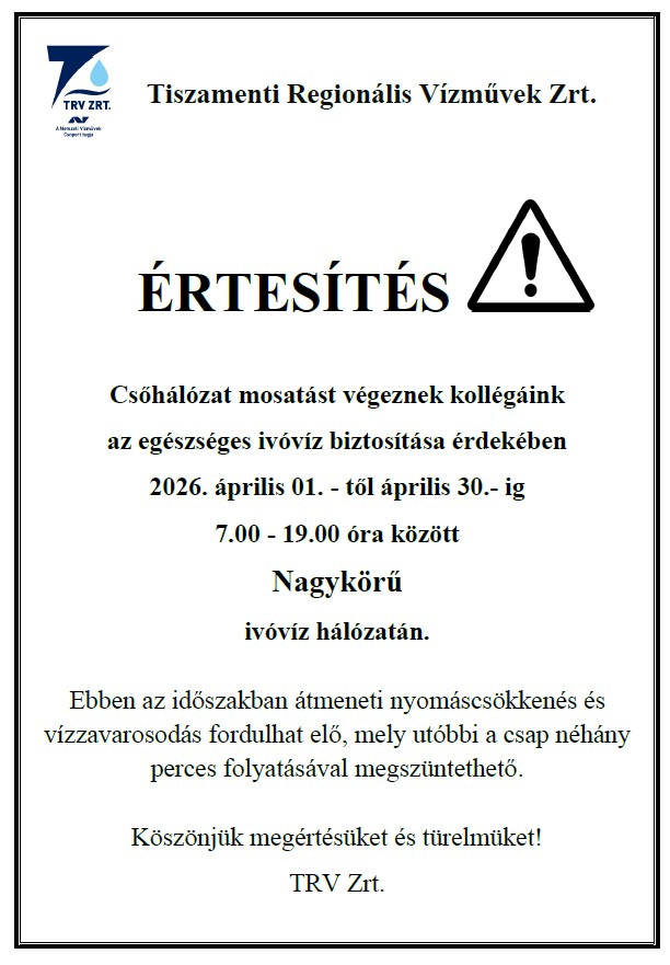 ÉRTESÍTÉS – CSŐHÁLÓZAT MOSATÁS