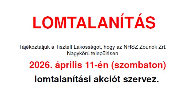 Tájékoztatjuk a Tisztelt Lakosságot, hogy az NHSZ Zounok Zrt. Nagykörű településen 2026. április 11-én (szombaton) lomtalanítási akciót szervez. Az akció során lehetősége van a település valamennyi ingatlan tulajdonosának, hogy a háztartásában keletkező lomokat, selejtezésre került, használhatatlan bútorokat ingyenesen elszállíttathassa.… Read More »LOMTALANÍTÁS